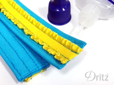 Assemblez l’élastique au tissu à la machine. Appliquez le Fray Check sur chaque extrémité pour éviter que le tout ne s’effiloche après plusieurs semaines d’utilisation. |