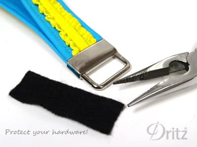 Pliez la bande de tissu, glissez-la dans la quincaillerie du porte-clés. Refermez le tout avec une pince. Un conseil : intercalez un petit morceau de tissu entre la pince et la quincaillerie pour éviter les rayures. |