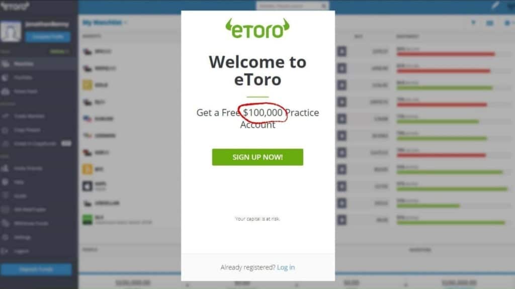 - Le trader devra d’abord s’inscrire sur le site Web eToro avant d’avoir accès à la possibilité de passer son compte en direct à un compte « virtuel » ou démo.
