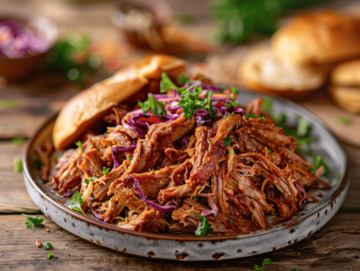 Le pulled pork s’accompagne parfaitement de sauce barbecue maison, de coleslaw ou de pain de maïs. Pour une présentation élégante, servez-le dans des petits pains briochés, en burger ou sur un lit de salade.