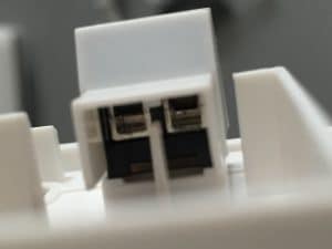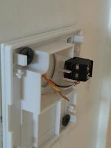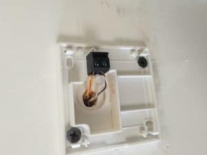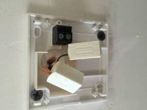 Dans ce cas précis, le câble de téléphone comportait quatre fils, alors que le manuel Netatmo en prévoit deux. Pas de panique, il suffit de reprendre la même logique que l’installation initiale : ici, jaune/orange en haut, blanc/gris en bas, comme le montre la photo. On sécurise le tout avec des dominos ou des connecteurs adaptés. La partie blanche du boîtier, elle, n’est qu’un cache amovible.
